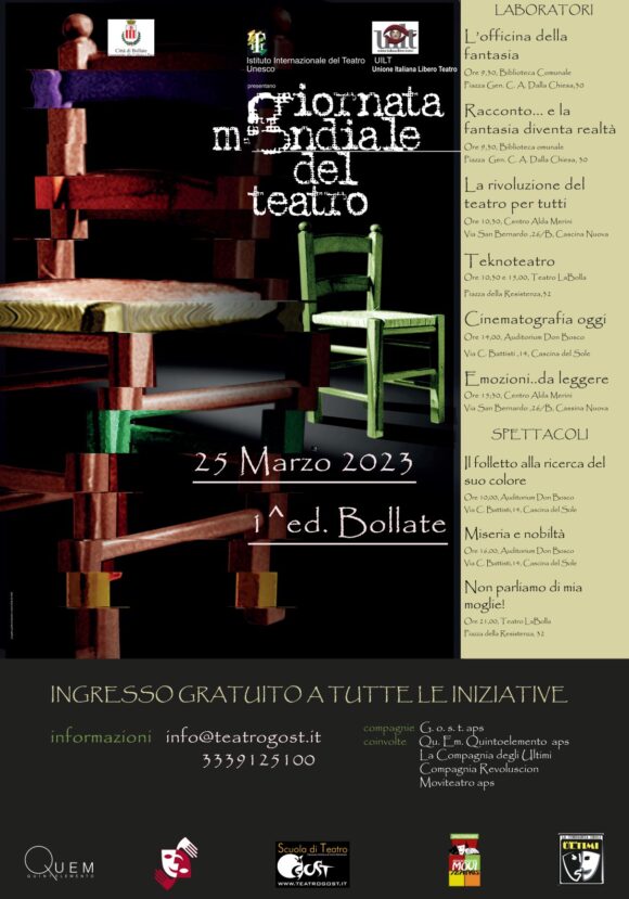 Un programma davvero ricco di eventi teatrali il 23 marzo, giorno in cui U.I.L.T. e G.O.S.T in collaborazione con il Comune di Bollate e altre realtà teatrali bollatesi festeggeranno la Giornata Mondiale del Teatro.